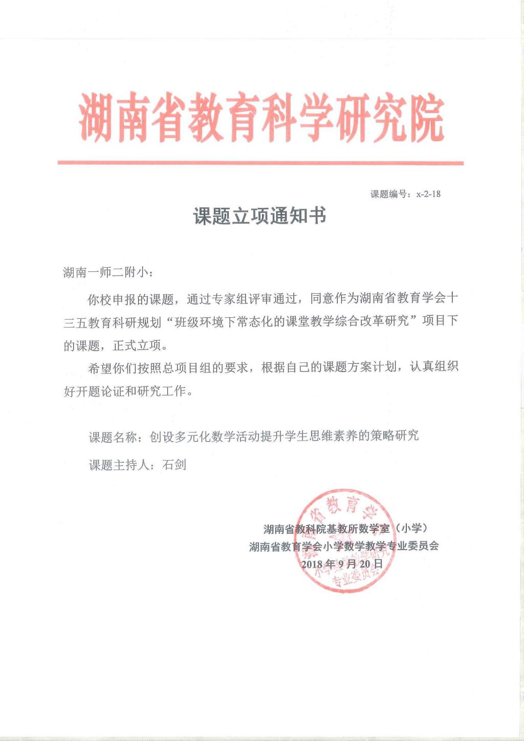 课题成果:“班级环境下常态化的课堂教学综合改革研究”立项通知书